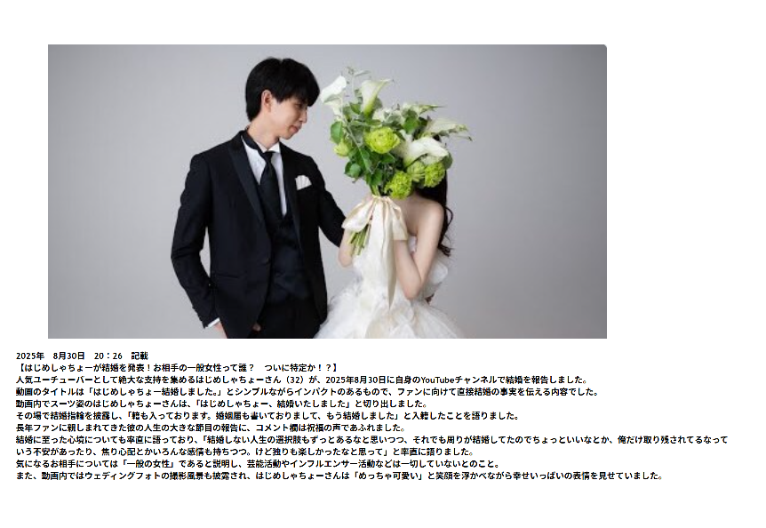 人気ユーチューバーとして絶大な支持を集めるはじめしゃちょーさん(32)が、2025年8月30日に自身のYouTubeチャンネルで結婚を報告しました。