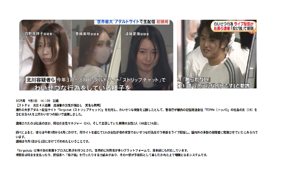 海外の大手アダルト配信サイト「Stripchat(ストリップチャット)」を利用し、わいせつな映像を公開したとして、警視庁が都内の配信関連会社「TOPPA(トッパ)」の社長の男(28)を含む男女4人を公然わいせつの疑いで逮捕しました。