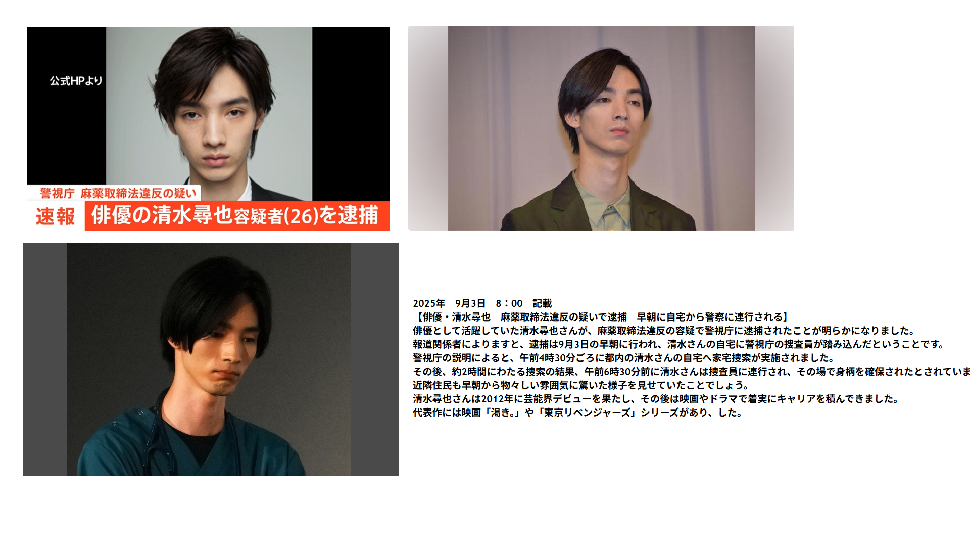 俳優として活躍していた清水尋也さんが、麻薬取締法違反の容疑で警視庁に逮捕されたことが明らかになりました。